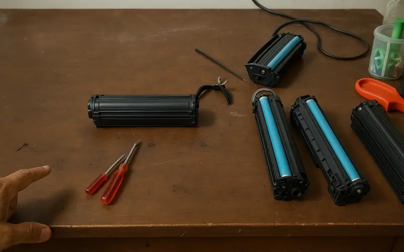 اولین گام، بررسی پودر تونر است. تونر در مدلهای HP معمولاً بین ۸۰ تا ۹۰ گرم وزن دارد و ترکیبی از پلیمر، رزین، آهن و رنگدانه است.